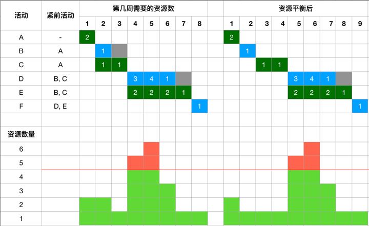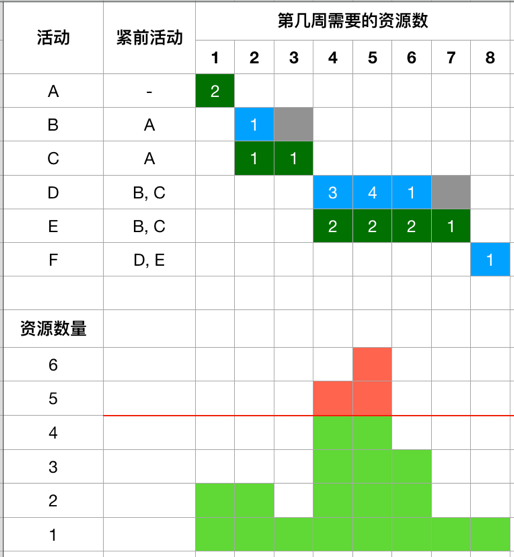 从上表可以看到,表格中的数字为每个活动在各周分别需要的资源数目,其中活动B和C可以并行开展,D和E也可以并行开展,其它都是逻辑关系完成到开始的顺序开展,灰色部分表示该活动的自由浮动时间。这个就是第一步用关键路径法做出来的理论可行的进度计划。下面绿色的资源柱状图表示项目每周需要的资源数量。