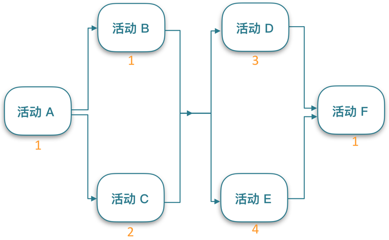 橙色数字为该活动所需的工期周数,也就是说活动A、B、C、D、E、F分别需要工期周数为1、1、2、3、4、1周,从图中我们可以知道该项目的关键路径为A-C-E-F。每个活动所需的资源数如下列表所示: