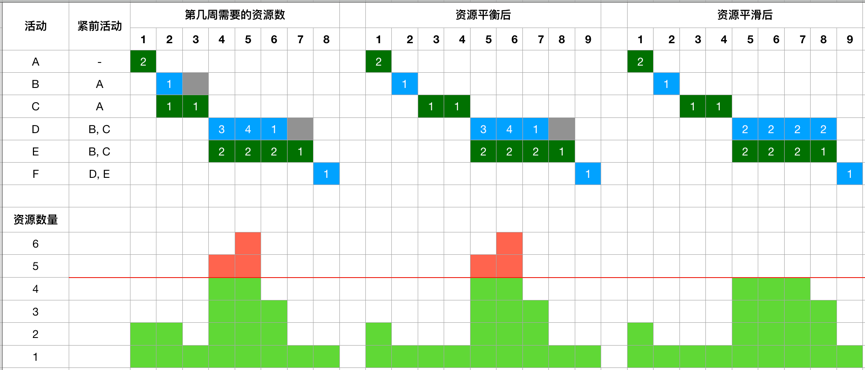 可以看到我们这儿把超出资源限制的这部分工作调整到了其他资源使用量不多的周上,从而使每周的资源使用量尽量地保持平稳。本项目中,我们也可以看到资源平滑也可能会使对应的活动工期延长(上图右边活动D的工期从资源平滑前的3周延长到资源平滑后的4周),但是该活动只在其自由和总浮动时间内延迟(灰色为该活动的浮动时间),这种调整就叫资源平滑。