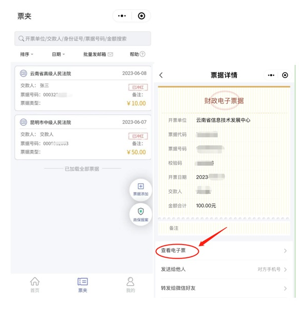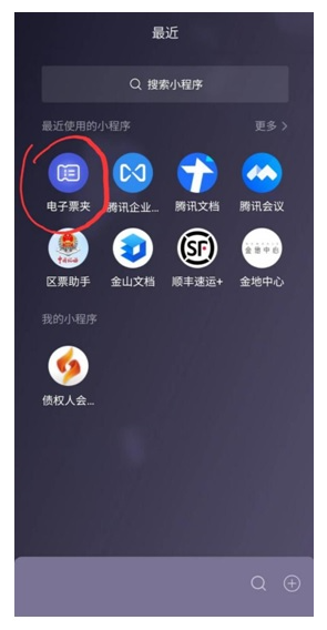2、注册之后,点小程序中间的“票夹”按钮,就可以查看和下载已经开出的电子票: