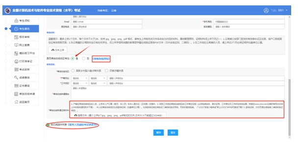 查看报考页面下方的“单独划线须知”,符合申报条件的报考人员在报考页面下方“是否单独划线地区考生”点选“是”,按要求上传申报材料,阅读承诺书并勾选已读,与报名信息一起等待审核。