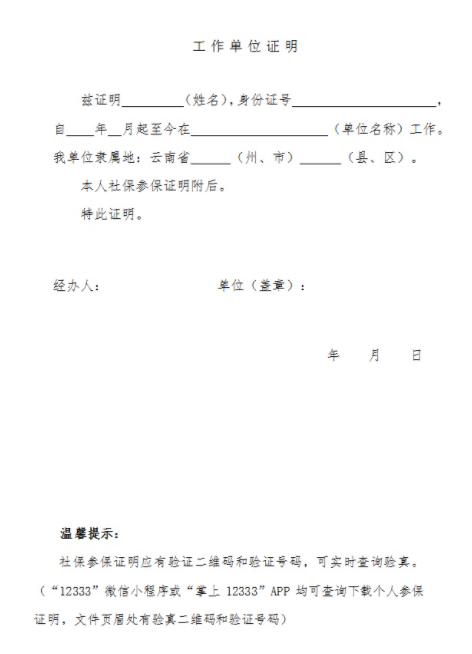 2.实际工作地在单独划线地区的工作单位证明(必须包括姓名、身份证号、工作单位及工作所在地地址等,样表在附件下载)、本人在单独划线地区社保参保证明(加盖单位公章)。社保参保证明应有验证二维码和验证号码,可实时查询验真。(“12333”微信小程序或“掌上12333”APP均可查询下载个人参保证明,文件页眉处有验真二维码和验证号码)
