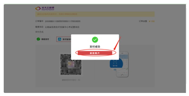 4、支付成功,会出现“支付成功”提示,点击“返回商户”回到报名系统。
