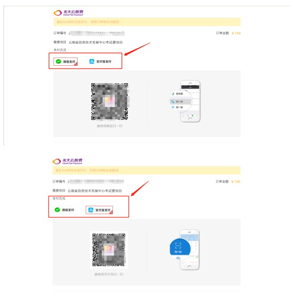 3、进入光大云缴费界面,选择“微信支付”或“支付宝支付”,扫码支付: