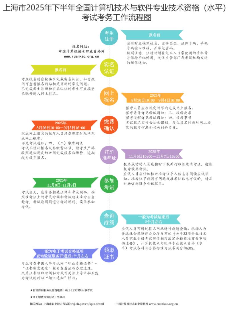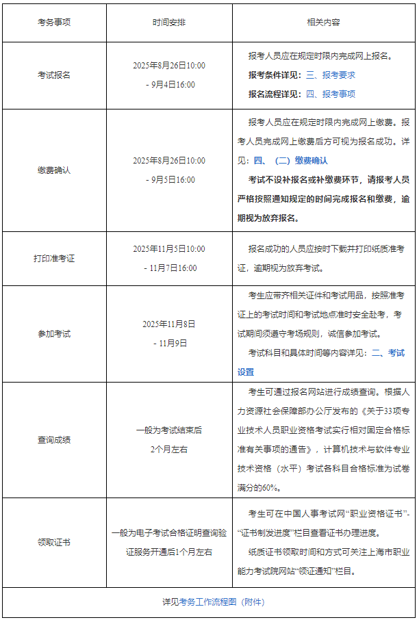 根据《全国计算机专业技术资格考试办公室关于2025年度计算机技术与软件专业技术资格(水平)考试工作安排及有关事项的通知》(计考办〔2025〕1号),结合本市实际,现将上海市2025年下半年全国计算机技术与软件专业技术资格(水平)考试工作有关事宜通知如下: