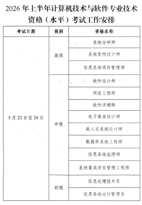 根据全国计算机专业技术资格考试办公室《关于2026年度计算机技术与软件专业技术资格(水平)考试工作安排及有关事项的通知》(计考办(2026)1号)的有关要求,现将2026年上半年计算机技术与软件专业技术资格(水平)考试工作通知如下: