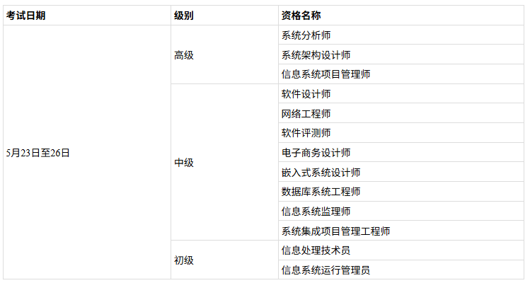 2026年度计算机技术与软件专业技术资格(水平)考试(初级、中级、高级)上半年考试日期为5月23日至26日,下半年考试日期为10月24日至27日。上半年、下半年各资格考试批次及时间安排另行通知。本次考试考场设置在南宁市,具体地点以准考证上的信息为准。